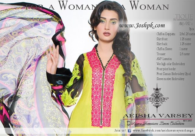 Aeisha Varsey Summer Lawn Designs Collection For Ladies.Aeisha Varsey has recently show the most recent assortment of Lawn dresses Designs For girls.Aeisha Varsey 2013 Embroidery Daaman Front Embroidery Front neck,embrace Pants Embroidery, , embroidery, fringe of sleeve back then on. These add-ons area unit extremely about to build the costumes look fabulous. a number of these dresses area unit offered in additional than one color conjointly. So, if you wish garments fabulous Lawn decorated, move to the gathering of Lawn Aeisha Varsey 2013.Aeisha Varsey within the trade of fashion since 1989. it's a accepted clothier whose work speaks for itself. It produces elegant dresses that also are terribly elegant. His talent is seen in his work.